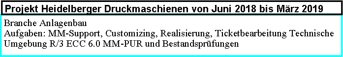 Branche Industrie, Darmstadt Aufgaben: Support PP, MM, SD und FI/CO. Einführung SAP mit einer harmonisierten Prozessablaufes aller Module in USA. Technische Umgebung R/3 ECC 6.0 Module SD, MM, PP, FI, CO  |