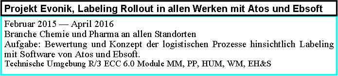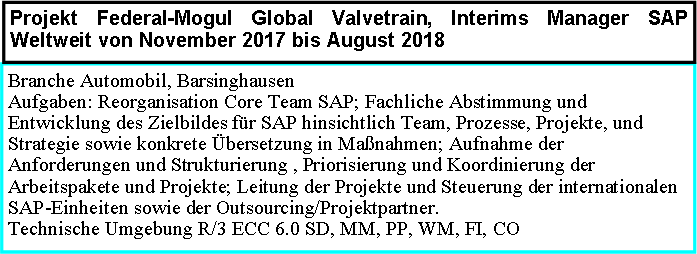 Branche Industriehersteller an allen Standorten Aufgabe: Bewertung der Prozesse, der CR und der Anforderungen aus den Projekten. Derzeit ein Projekt weltweites Rollout von SAP. Standardisierung und Harmonisierung der Prozesse. Steuerung des Teams aus AO, Beratern und Entwickler im SD und CS Umfeld. Technische Umgebung R/3 ECC 6.0 Module SD und CS  |